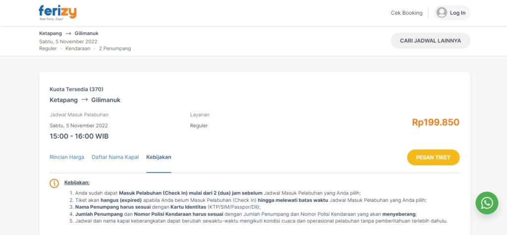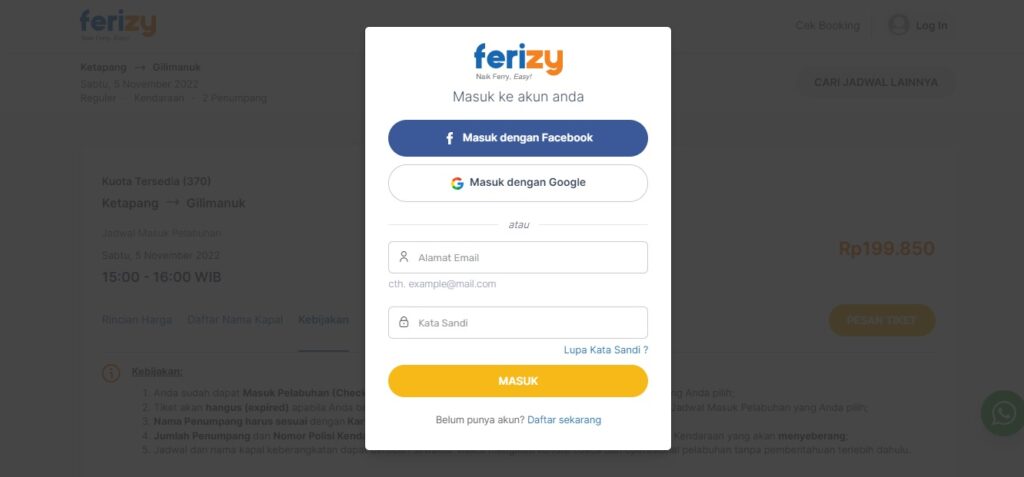 - Bila kamu sudah merasa puas dan sesuai dengan jadwal tersebut maka kamu klik “PESAN TIKET” dan kamu akan diminta untuk login terlebih dahulu bila kamu sudah pernah membuat akun di ferizy.com bila belum maka kamu harus membuat akun terlebih dahulu dengan klik “Daftar sekarang”