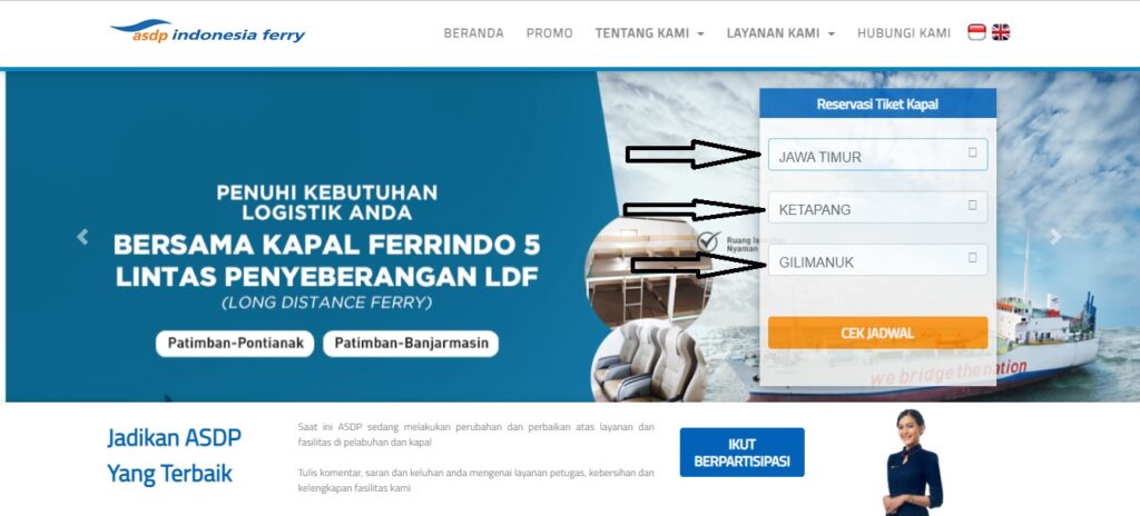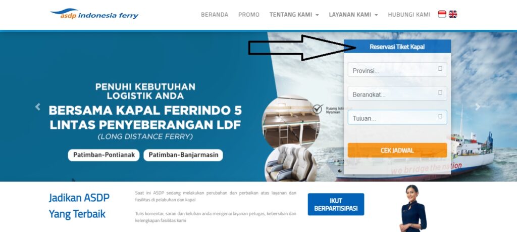 - Di halaman beranda akan tampak di kanan atas sebuah kolom “Reservasi Tiket Kapal”.