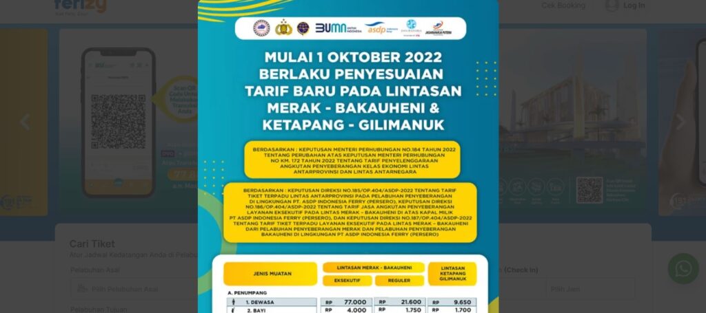 Untuk laut/penyeberangan, pembelian tiket kapal lautnya sekarang dilakukan secara online, karena sedang dilakukan digitalisasi pelabuhan. PT ASDP Indonesia Ferry (Persero) ingin memberikan layanan yang optima kepada pelanggan dan memberikan kenyamanan pelanggan